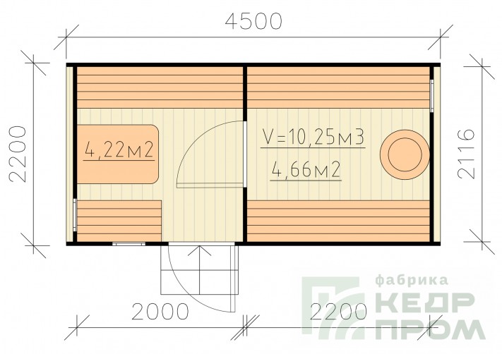 Круглая баня-бочка длиной 4,5 метра с входом сбоку. Данная модель бани будет удобна в первую очередь расположением и планировки и застройки участка таким образом, что вход возможен только с передней стороны фасада. А также внутреннее пространство может показаться более удобным и комфортным в сравнении с классическим входом с торца.